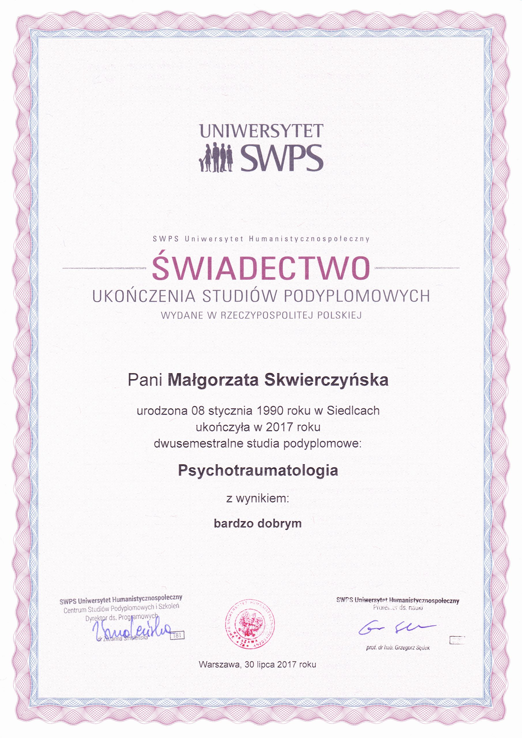 Nazywam się Małgorzata Jurek (Skwierczyńska), jestem psychologiem wojskowym, psychotraumatologiem, psychoterapeutą EMDR i psychoterapeutą poznawczo-behawioralnym w trakcie szkolenia. Poza tym podróżniczka, pasjonatka strzelectwa i robótek craftowych.